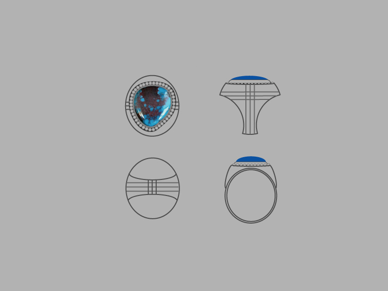 ターコイズを留めるベゼルの周囲を一周するようにドロップを配しました。