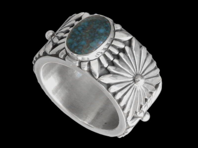 ターコイズを囲むベゼルは単にサンバーストモチーフにロウ付けしたのではなく、