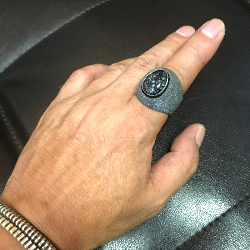 黒く燻した台座とRoyal Webの相性は抜群です。着けるとこんな感じです。Royal Webは派手な石ではないので、様々なデザインにマッチしますが、