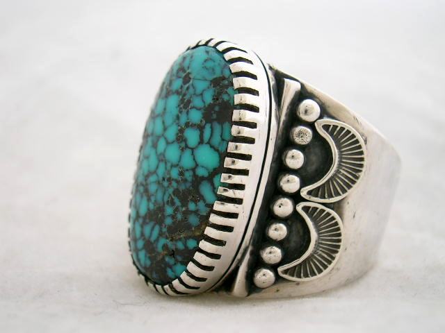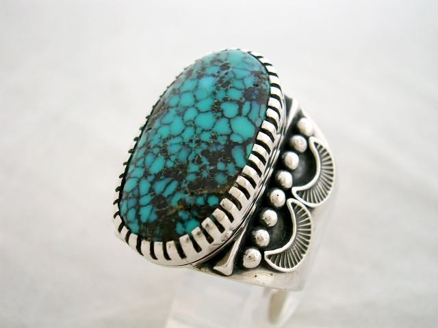 画像のリングはお客様より委託されたNavajo(ナヴァホ)アーティストHoward Nelson(ハワード・ネルソン)のネヴァダブルーターコイズをセットしたリングです。