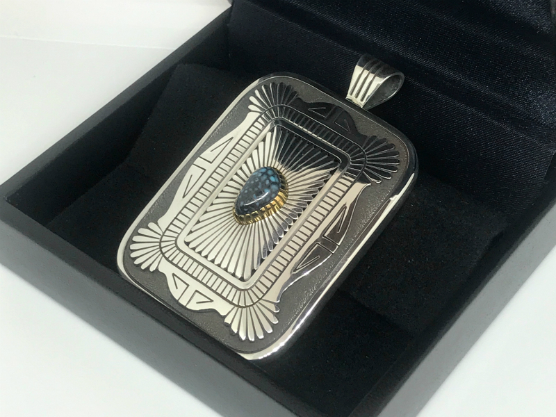 中空のいわゆるボックスペンダントの上面にはサンバーストとナヴァホの伝統的な模様を組み合わせたデザインがオーバーレイされています。