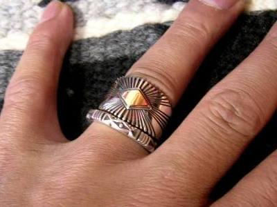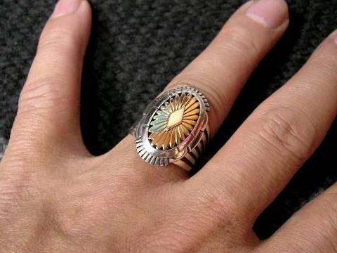 Pat Bedonieの14金サンバーストリングとThomas Curtisのリングの重ね付け
